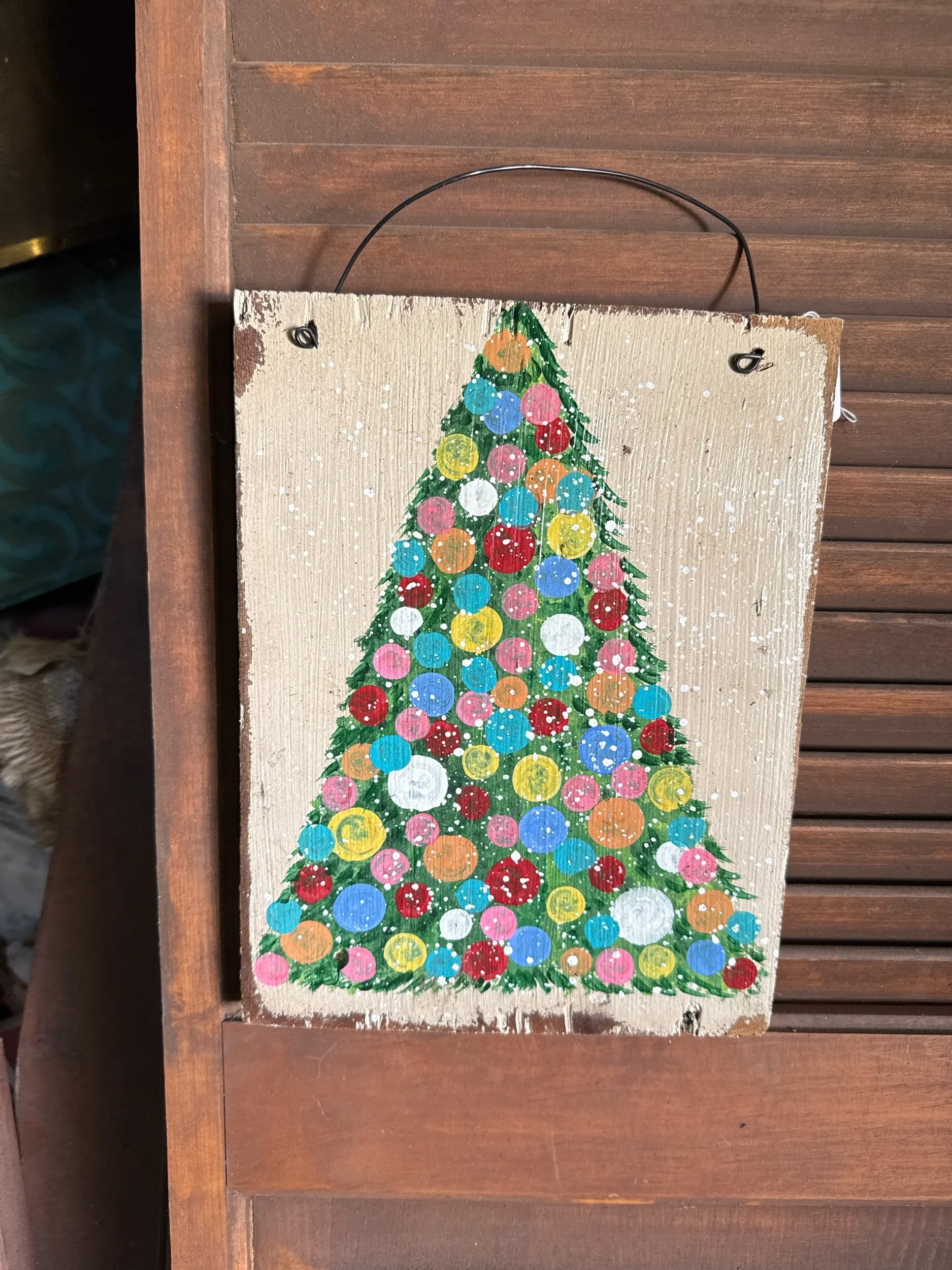 This sign is painted on a reclaim board that measures 7 1/2 inches wide by 10 inches tall and 1/2 inch thick. It is gray with a protective clearcoat and has a wire hanging.