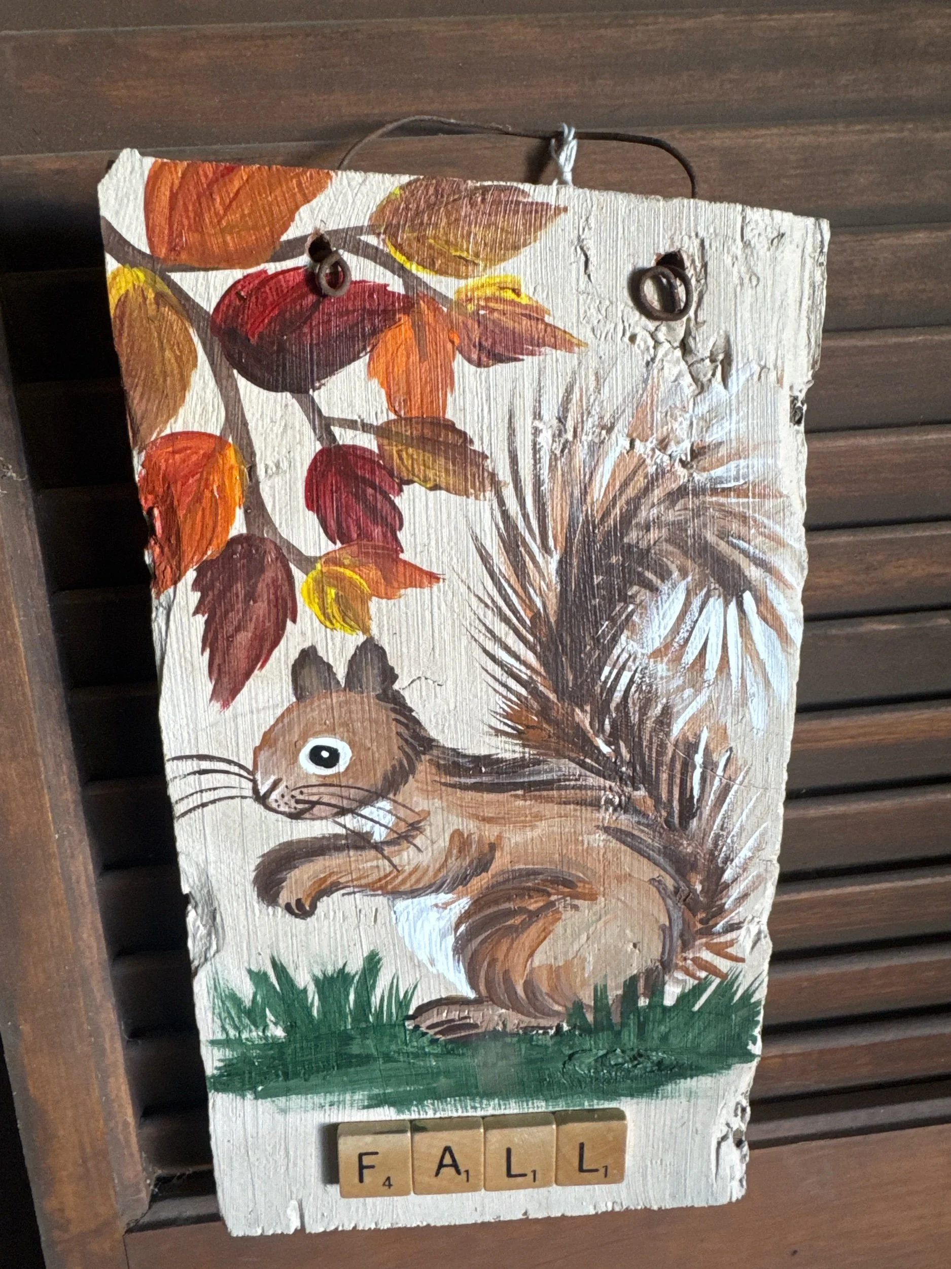 This sign is hand painted on a reclaim board that measures 5 3/4 across and 10 1/2 inches tall. It is sprayed with a protective clear and has a wire for hanging. It also has three dimensional Scrabble tile letters attached to the front.