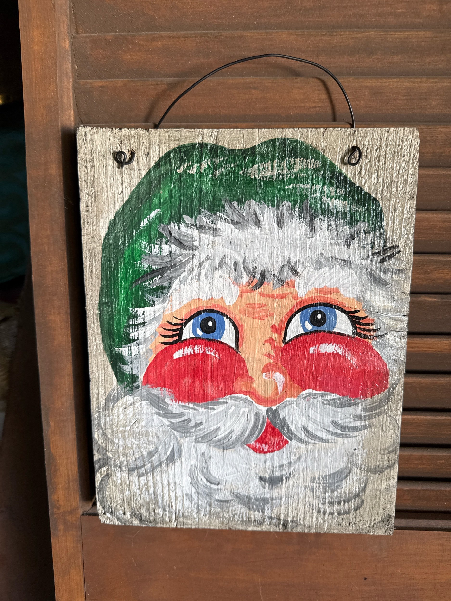 This sign is painted on a reclaimed board that measures 7 1/2 inches wide by 9 1/4 inches tall and 1/2 inch thick. It is sprayed with a protective clearcoat and has a wire for hanging.