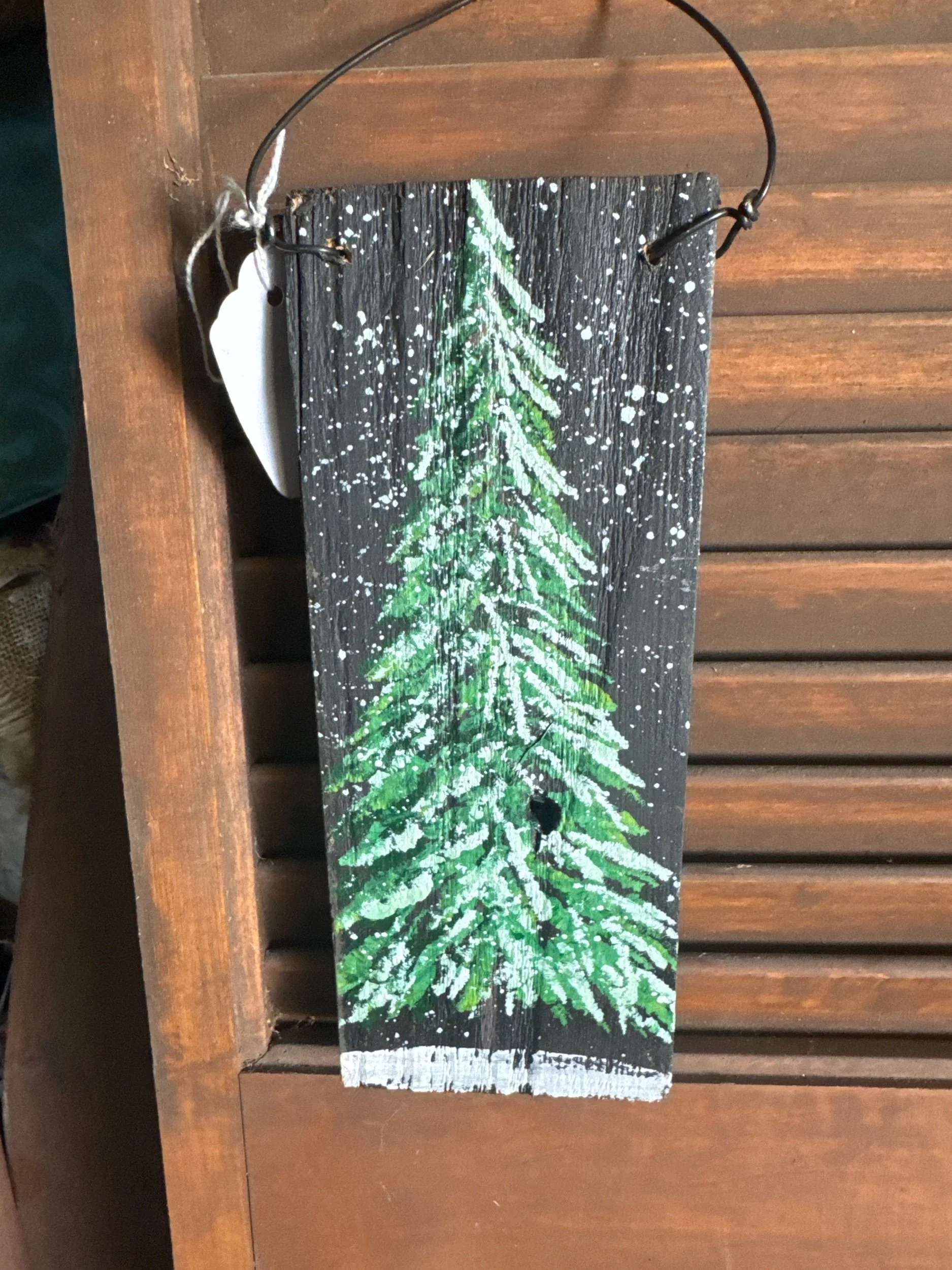 This tree is painted out a reclaim board that measures 3 1/4 inches wide by 8 inches tall and 1/2 inch thick. It is sprayed with a protective clear coat has a wire hanging.