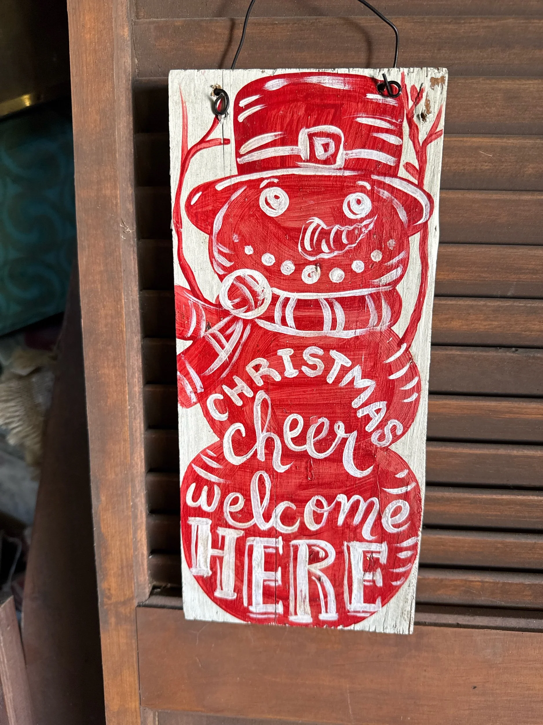 This sign is hand paid on a reclaim board that measures four and three-quarter inches wide by 10 and three-quarter inches tall by 1/2 inch thick. It is sprayed with a protective clearcoat and has tiny glitter sparkles in the coating. It has a wire for hanging.