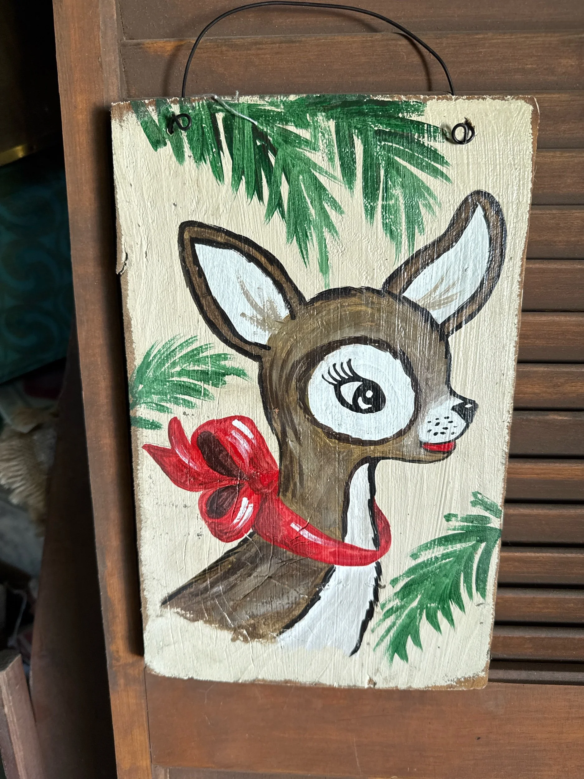 This vintage style deer is painted on a board that measures 7 1/2 inches wide by 12 inches tall and 1/2 inch thick. It is sprayed with a protective clearcoat and has a wire for hanging.