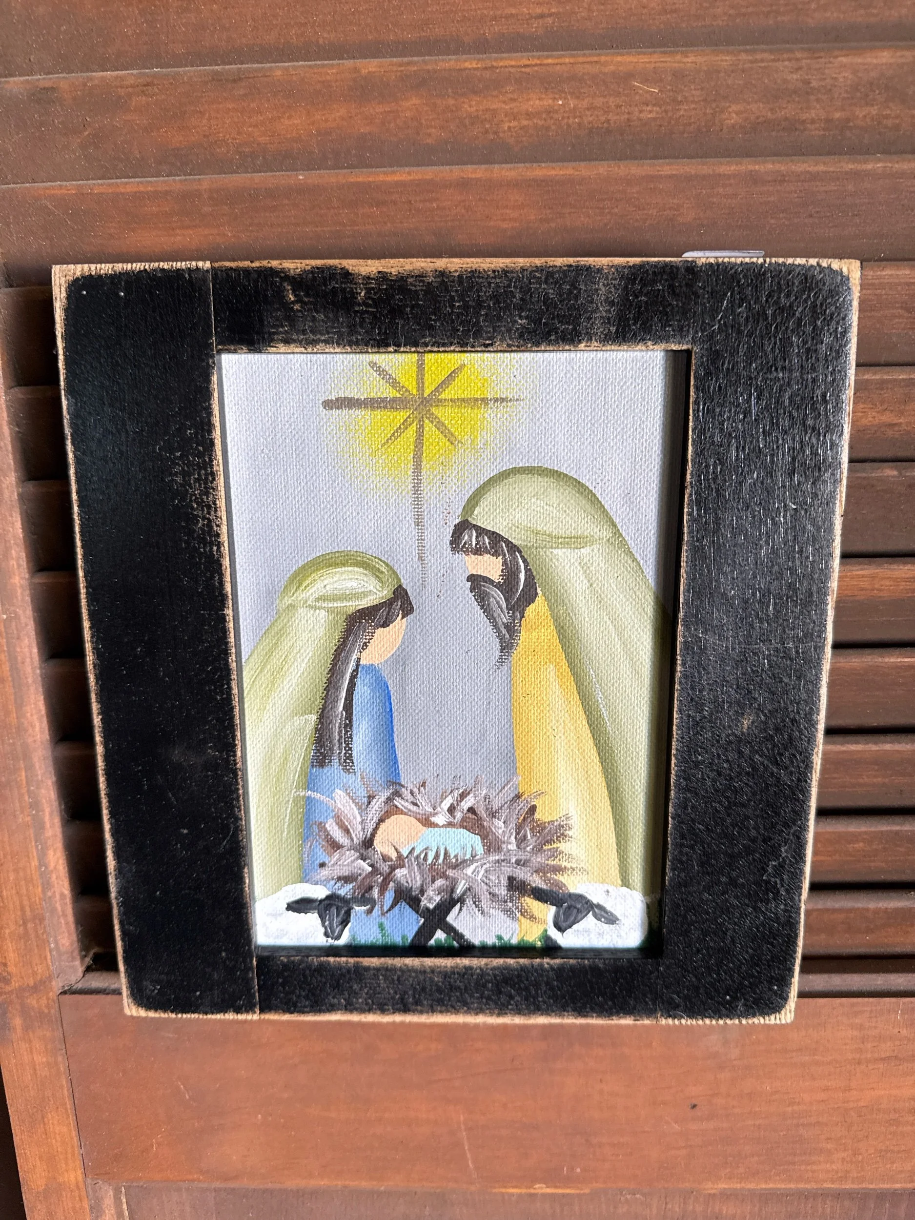 This nativity scene his hand painted on canvas. It measures 7.5 inches wide by 8 inches tall by 1/2 inch thick. The frame has a kickstand, so it can sit on a shelf and it also has a hanger so it can hang on a wall.