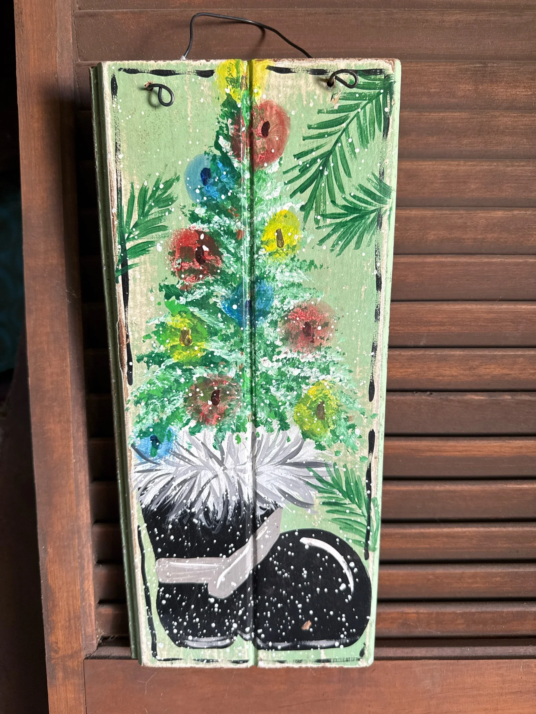 This sign is hand painted on a board that measures 5 1/2 inches wide by 12 inches high and 1/2 inch thick sprayed with a protective clearance has a wire for hanging.