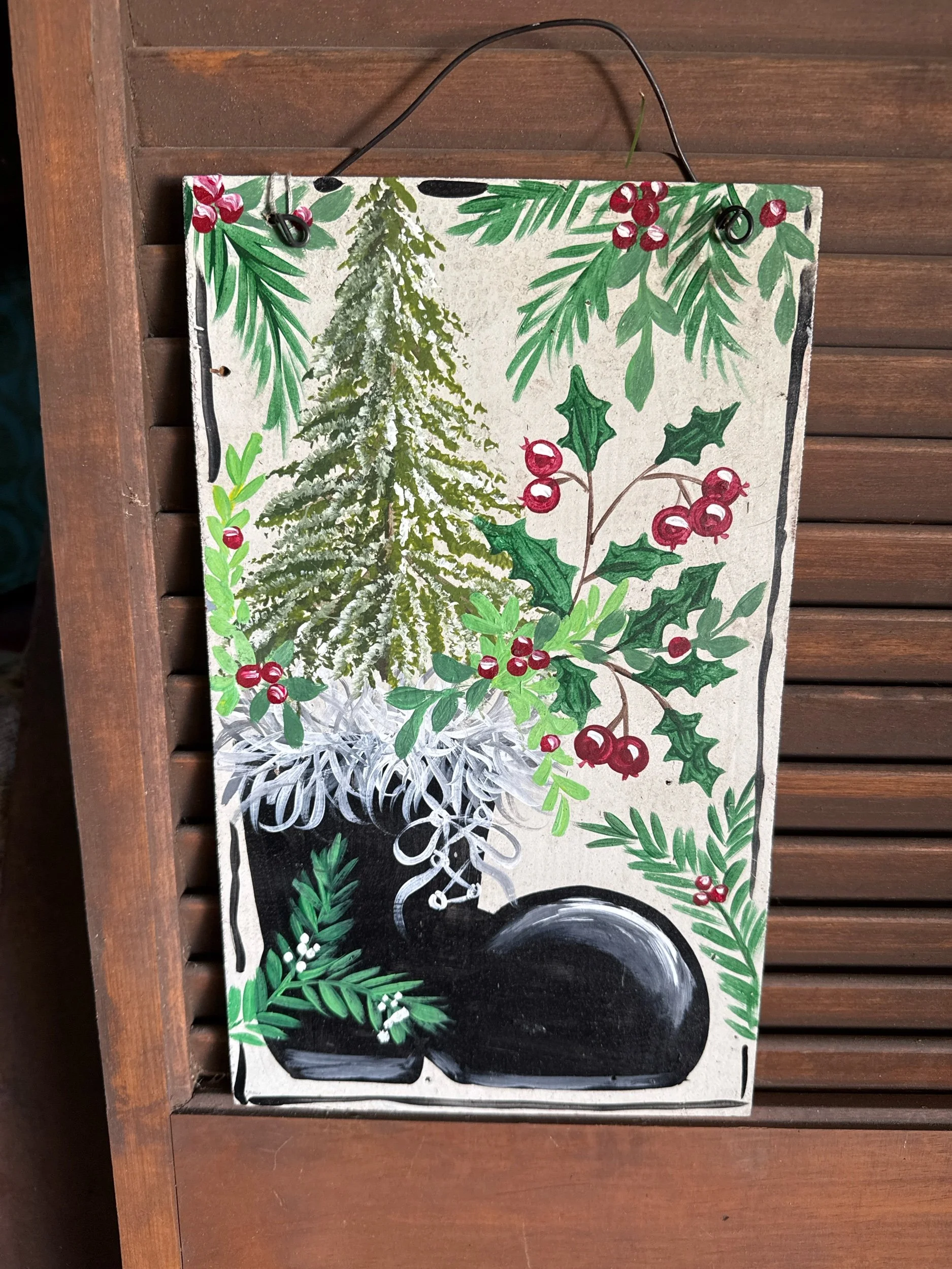 This sign is handpainted on a reclaim board that measures 7 inches wide by 11 3/4 inches tall by 1/4 inch thick. It is sprayed with a protective clear and has a wire for hanging.