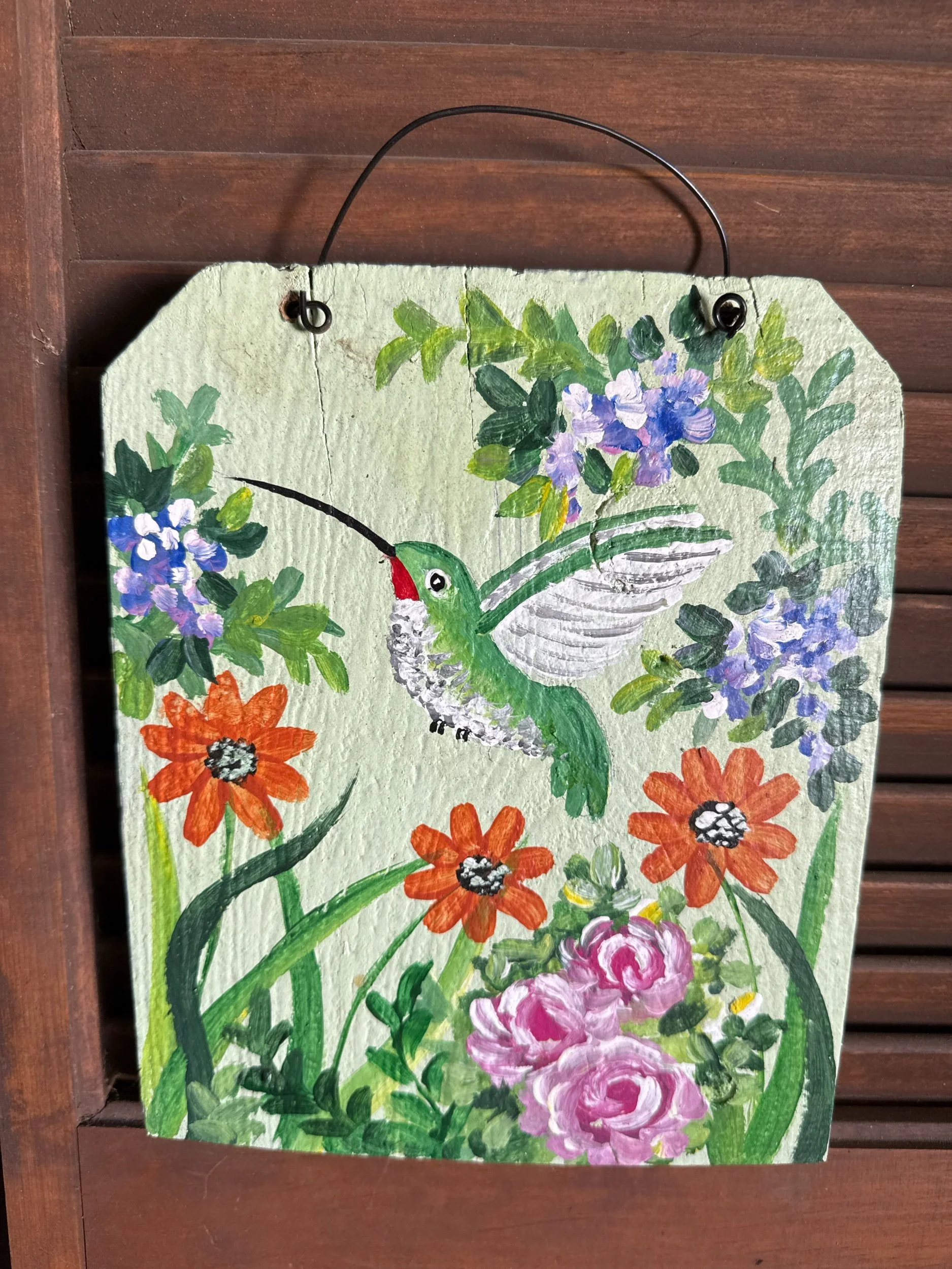 The sign is hand painted on a board that is 7 1/2 inches wide by 9 inches tall and 1/2 inch thick . It is sprayed with a protective Clear Coat and has a wire for hanging.
